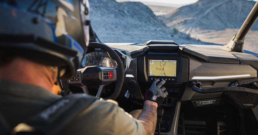 « Écran RIDE COMMANDMD de 7 po avec touche tactile résistif : Visualiseur DYNAMIX 2.0, GPS intégré, conduite en groupe (par téléphone cellulaire ou GPS), cartographie topographique, connectivité Bluetooth et USB pour téléphone intelligent, radio AM/FM et météo (haut-parleurs requis - vendus séparément), communications à bord du véhicule possibles avec casques d'écoute Sena en option, système antivol P.A.S.S. de Polaris. Cadrans analogiques à double balayage avec centre d'information du pilote à écran LCD de 4'' : Rétro-éclairage et luminosité bleu/rouge sélectionnables par l'utilisateur, intervalles d'entretien programmables. Instrumentation numérique : Indicateur de vitesse, tachymètre, compteur kilométrique, totalisateur partiel, horloge, compteur d'heures, indicateur de vitesse, jauge de carburant, température du liquide de refroidissement, voltmètre, indicateur et codes d'entretien, témoin de rappel de ceinture de sécurité, indicateur de vitesse, prise de courant continu.